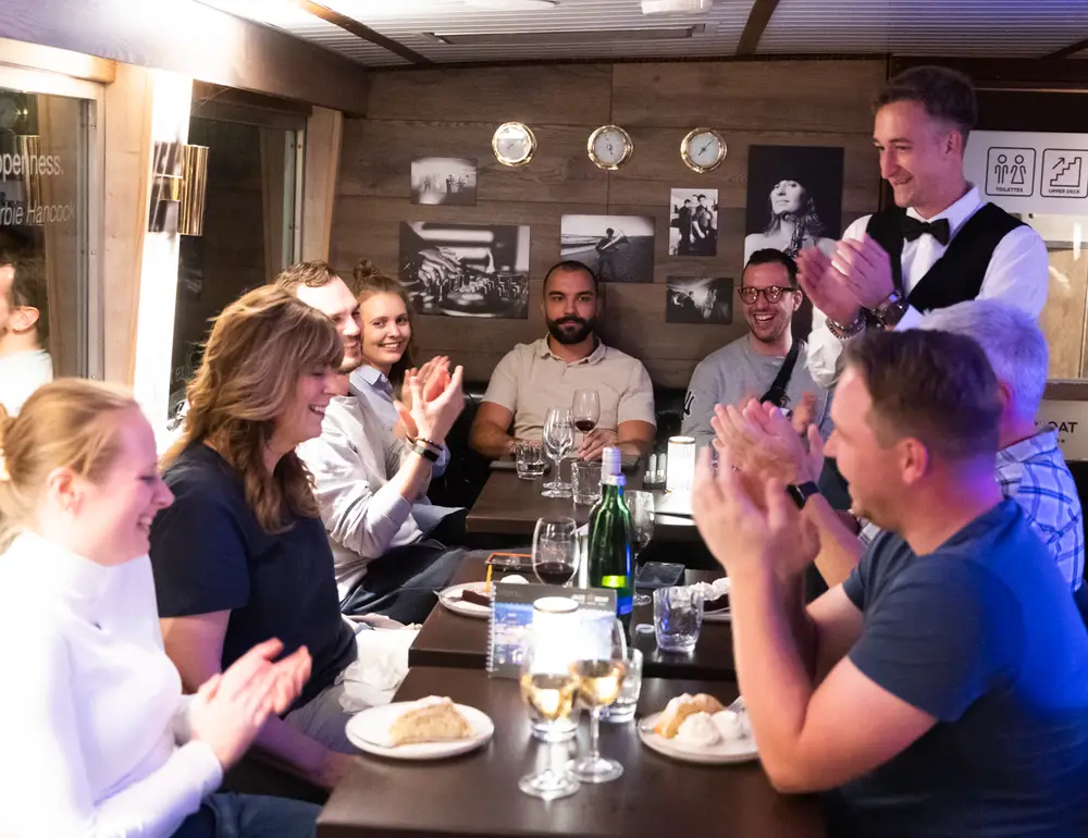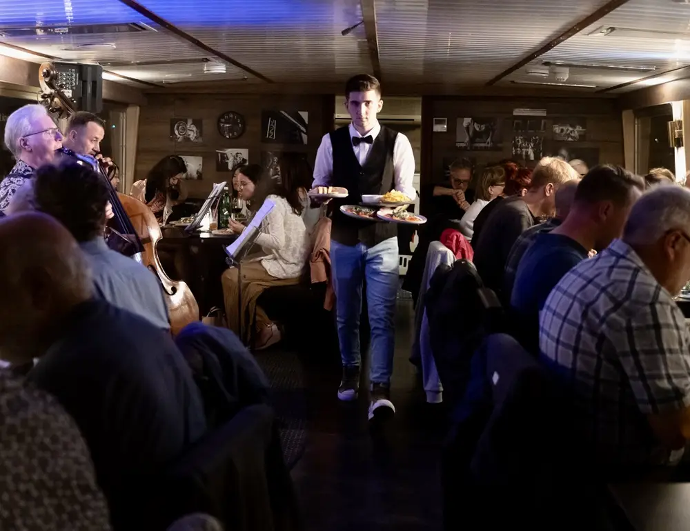 Restaurace Jazz Boatu poskytuje kulinářský zážitek během vaší plavby. Přátelská a rychlá obsluha u stolu. Večeře doprovázená vynikajícími místními víny a pivem. Pohodlně se usaďte, relaxujte a užijte si nezapomenutelnou romantickou noc v Praze!
